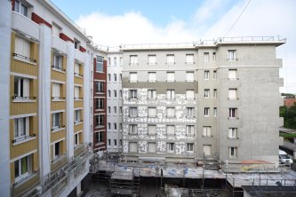 Le revêtement aspect brique est complété par la pose de nombreuses modénatures de façade pour conserver l’aspect caractéristique initial des appuis de fenêtre, bandeaux et corniches ainsi que des grilles d’aération en terre cuite émaillée, réalisées spécialement sur-mesure et reproduites à l’identique.